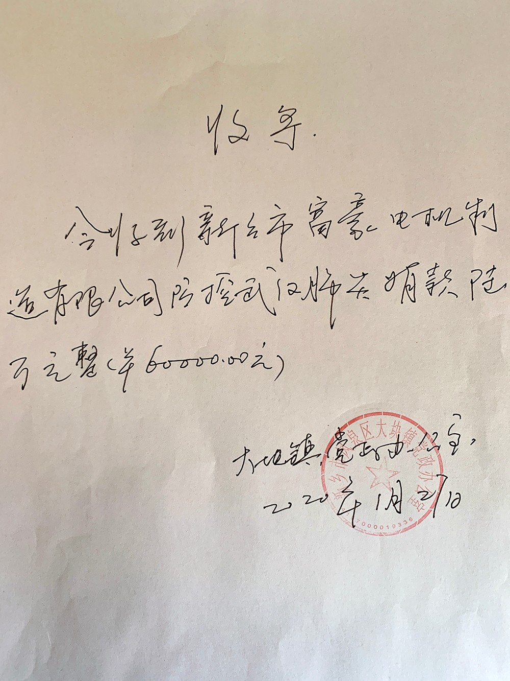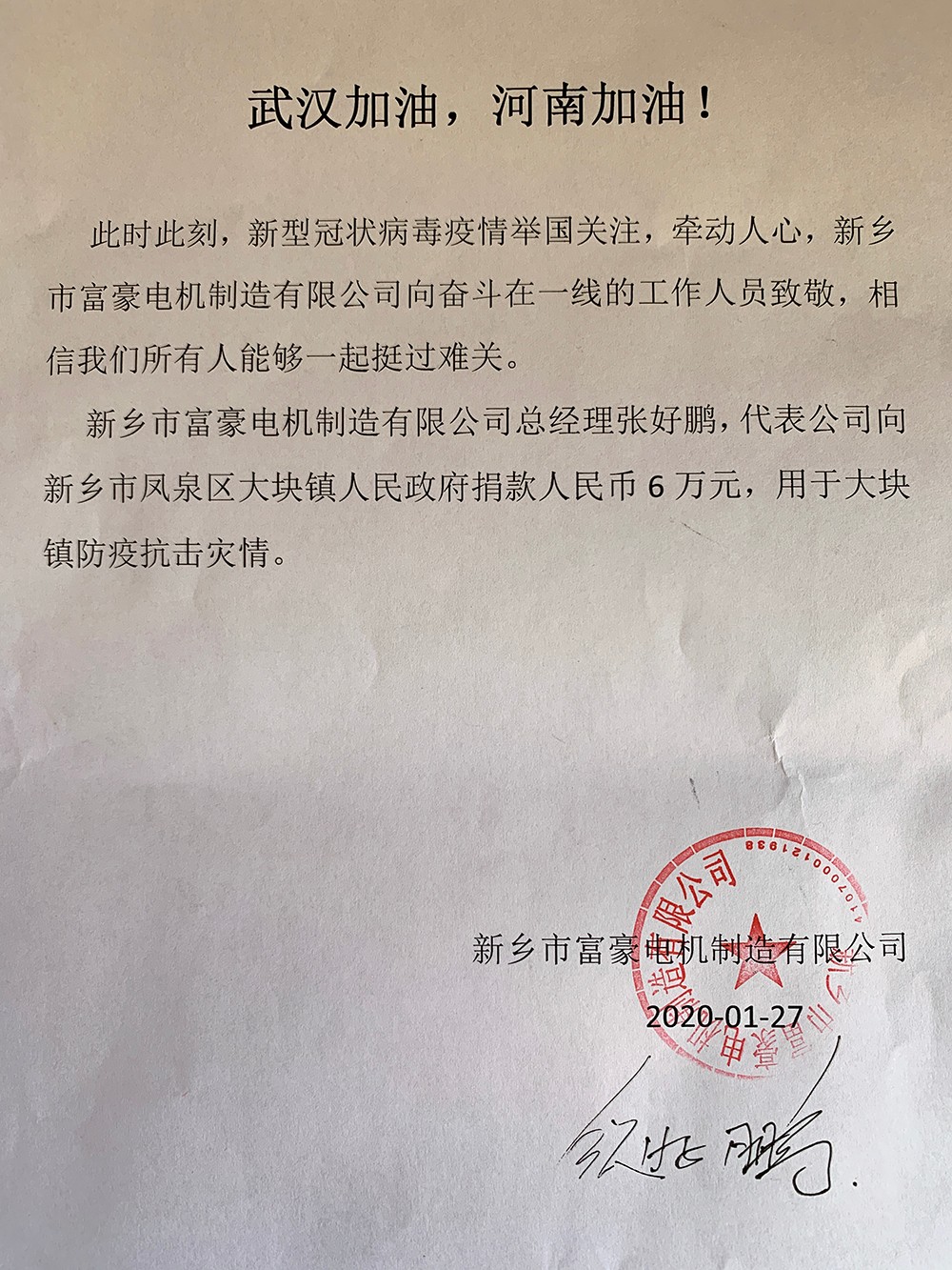 新鄉(xiāng)市富豪電機(jī)制造有限公司總經(jīng)理張好鵬,代表公司向新鄉(xiāng)市鳳泉區(qū)大塊鎮(zhèn)人民政府捐款人民幣6萬(wàn)元,用于大塊鎮(zhèn)防疫抗擊災(zāi)情。